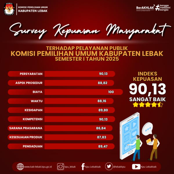 #TemanPemilih, Indeks Kepuasan Masyarakat KPU Kabupaten Lebak terhadap Pelayanan Publik pada Semester I Tahun 2025 ini mencapai nilai 90,13 dengan kategori Sangat Baik.