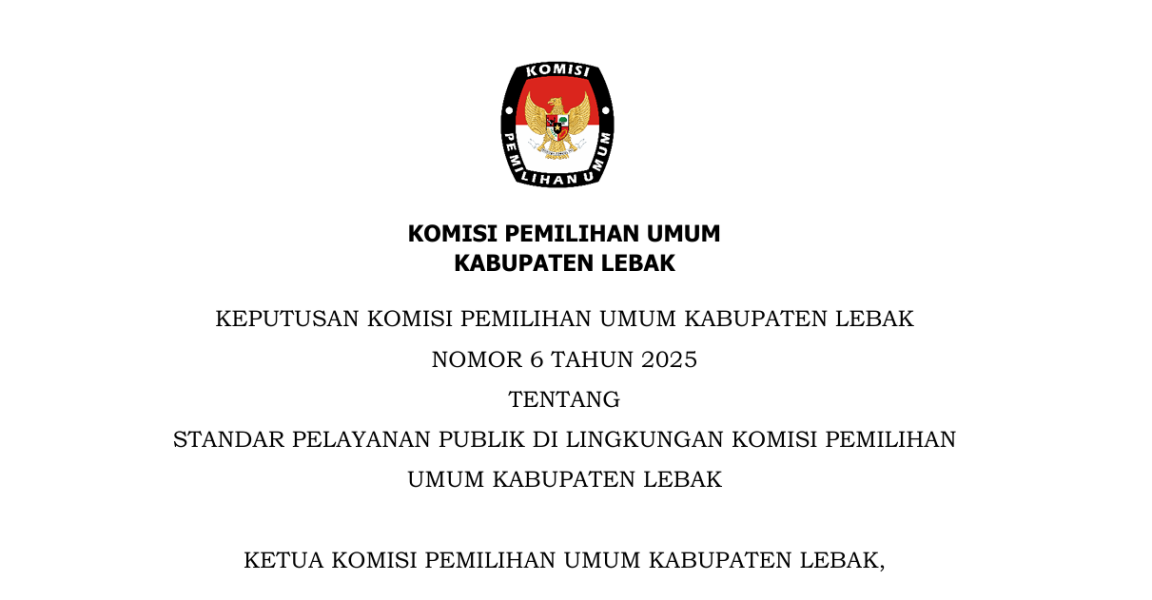 #TemanPemilih, berikut disampaikan Keputusan KPU Kabupaten Lebak Nomor 6 Tahun 2025 tentang Standar Pelayanan Publik di Lingkungan Komisi Pemilihan Umum Kabupaten Lebak.