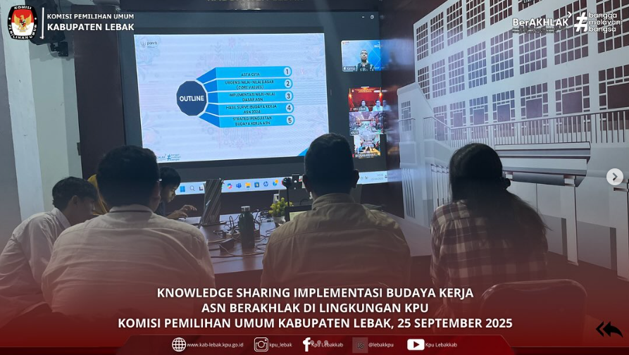 #TemanPemilih, Hari ini (Kamis, 25 September 2025) KPU Kabupaten Lebak mengikuti kegiatan Knowledge Sharing Implementasi Budaya Kerja BerAKHLAK secara daring yang diselenggarakan oleh KPU RI.