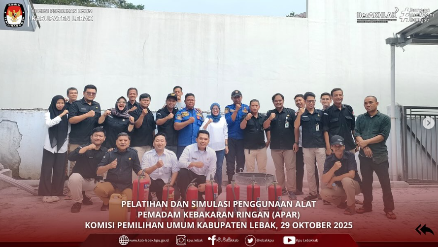 #TemanPemilih, KPU Kabupaten Lebak melaksanakan kegiatan Pelatihan dan Simulasi Penggunaan Alat Pemadam Api Ringan (APAR) yang diikuti oleh seluruh jajaran sekretariat, (Rabu, 29 Oktober 2025).