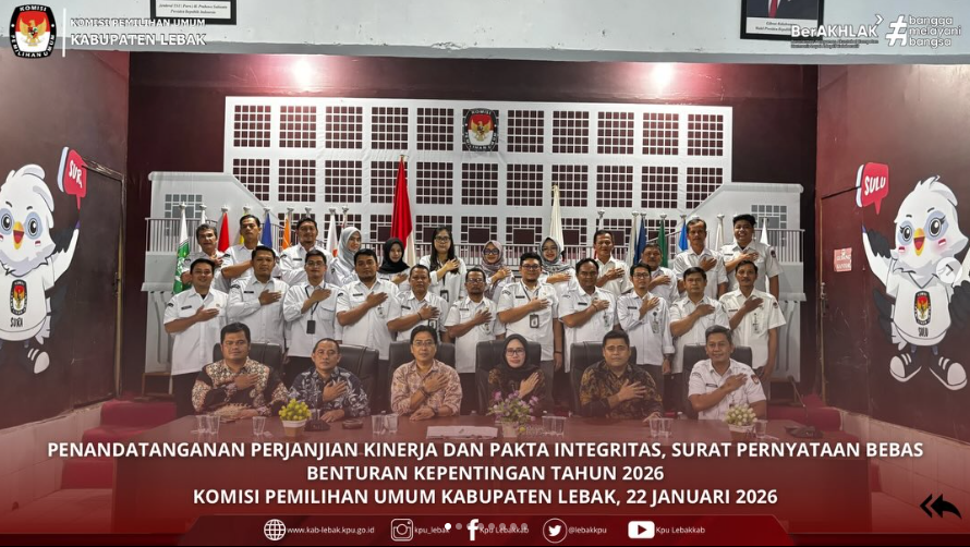 #TemanPemilih, Hari ini (Kamis, 22/01/2026) KPU Kabupaten Lebak melaksanakan Penetapan dan Penandatanganan Perjanjian Kinerja serta Pakta Integritas Tahun 2026 sebagai wujud komitmen bersama dalam meningkatkan kinerja kelembagaan yang profesional, akuntabel, dan berintegritas.