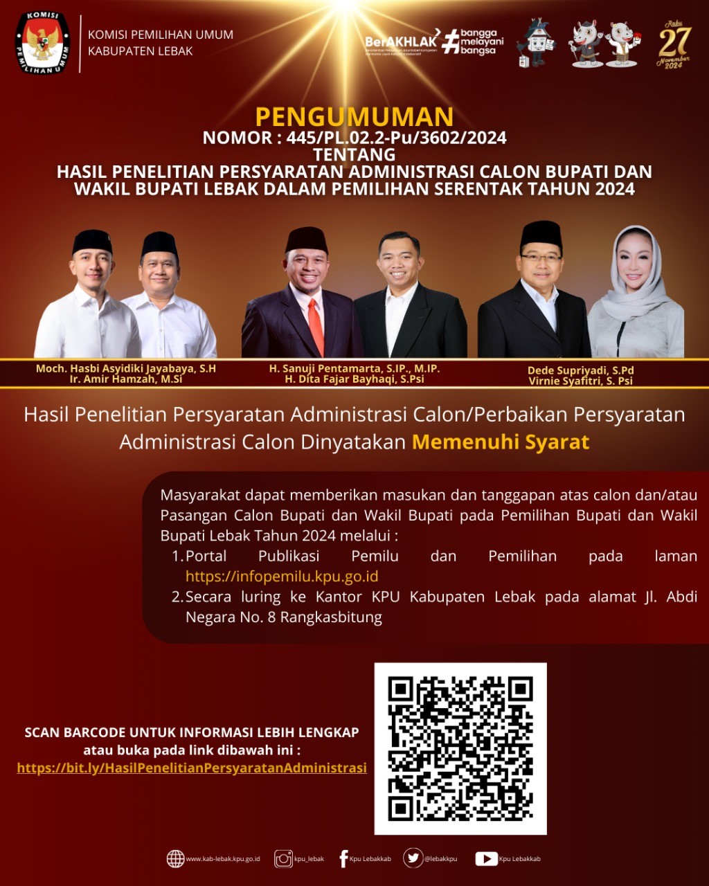 HASIL PENELITIAN PERSYARATAN ADMINISTRASI CALON BUPATI DAN WAKIL BUPATI LEBAK TAHUN 2024