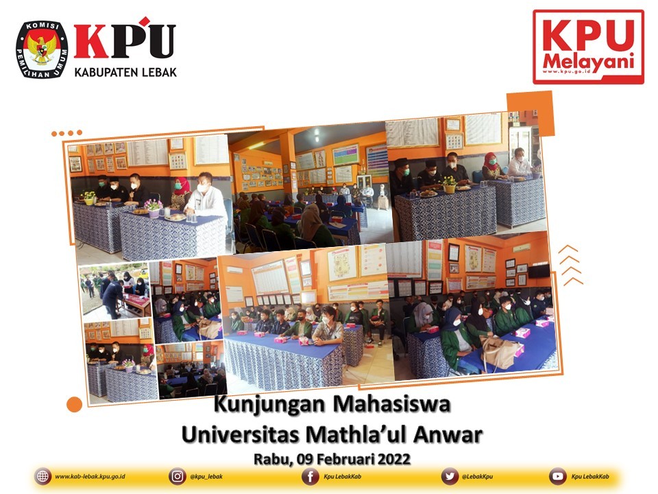 Hari ini Rabu 09 Februari 2022 Bertempat di ruang Rumah Pintar Pemilu, Anggota dan Sekretaris serta jajaran Sekretariat KPU Kabupaten Lebak menerima kunjungan dari Mahasiswa Universitas Mathla'ul Anwar. Dalam kunjungan tersebut selain bersilaturahmi, juga dipaparkan tentang birokrasi kepemerintahan dan kepemiluan.
