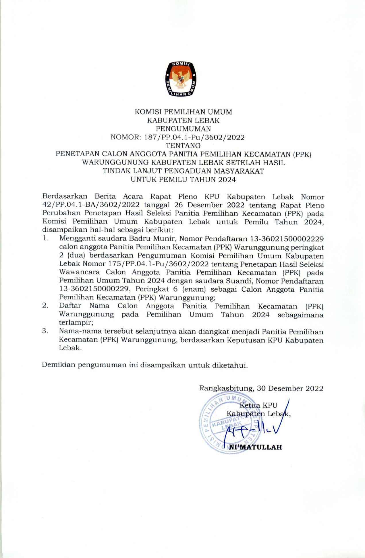PENGUMUMAN PENETAPAN CALON ANGGOTA PEMILIHAN KECAMATAN (PPK) WARUNGGUNUNG KABUPATEN LEBAK SETELAH TINDAK LANJUT PENGADUAN MASYARAKAT UNTUK PEMILU TAHUN 2022