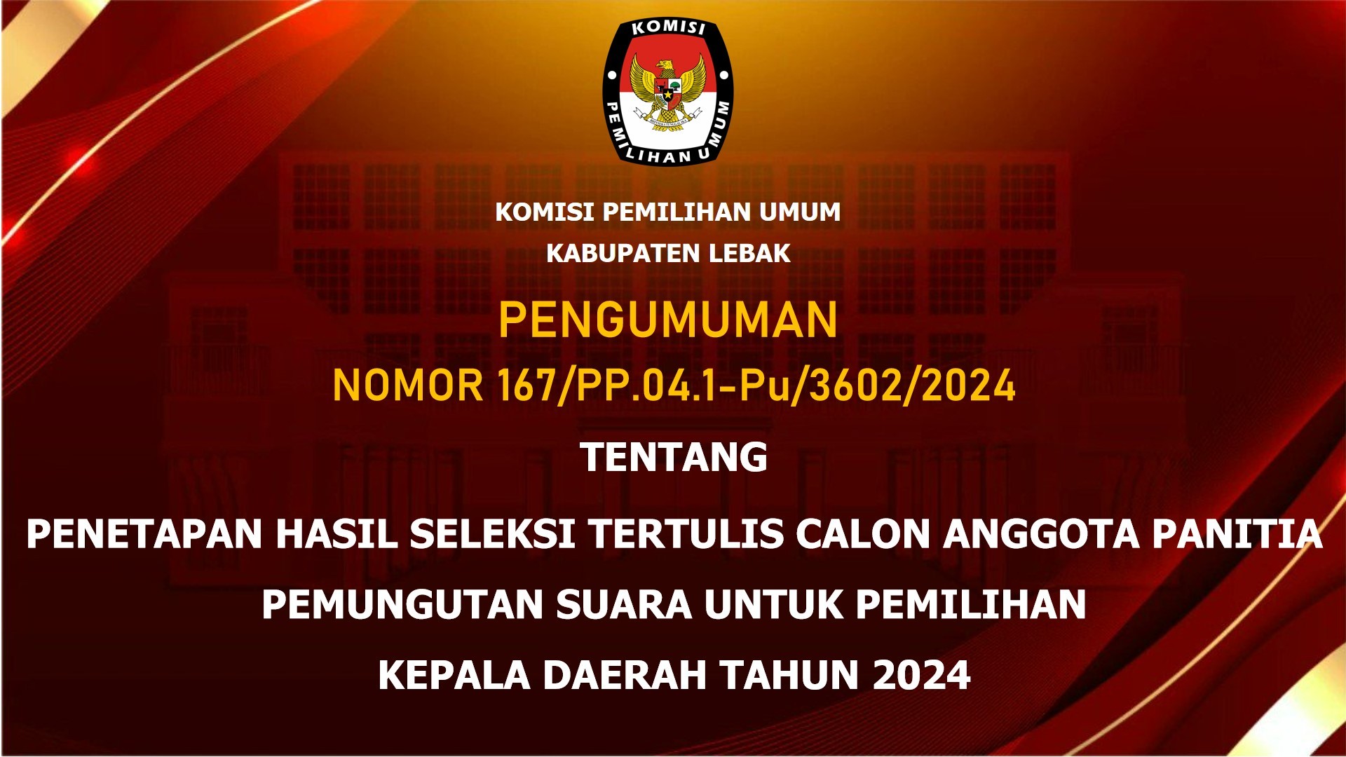 Berdasarkan Berita Acara Rapat Pleno KPU Kabupaten Lebak Nomor 96/PP.04.1-BA/3602/2024 tanggal 19 Mei 2024 tentang Penetapan Hasil Seleksi Tertulis Calon Panitia Pemungutan Suara untuk Pemilihan Kepala Daerah Tahun 2024, disampaikan hal-hal sebagai berikut: