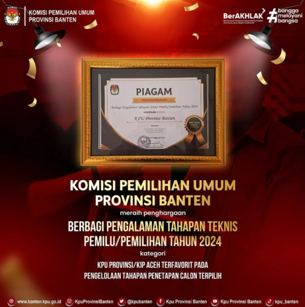 #TemanPemilih KPU Provinsi Banten meraih penghargaan Berbagi Pengalaman Tahapan Teknis Pemilu/Pemilihan Tahun 2024 kategori KPU Provinsi/KIP Aceh terfavorit pada pengelolaan Tahapan Penetapan Calon Terpilih dari KPU Republik Indonesia, Kamis (31/7/2025)