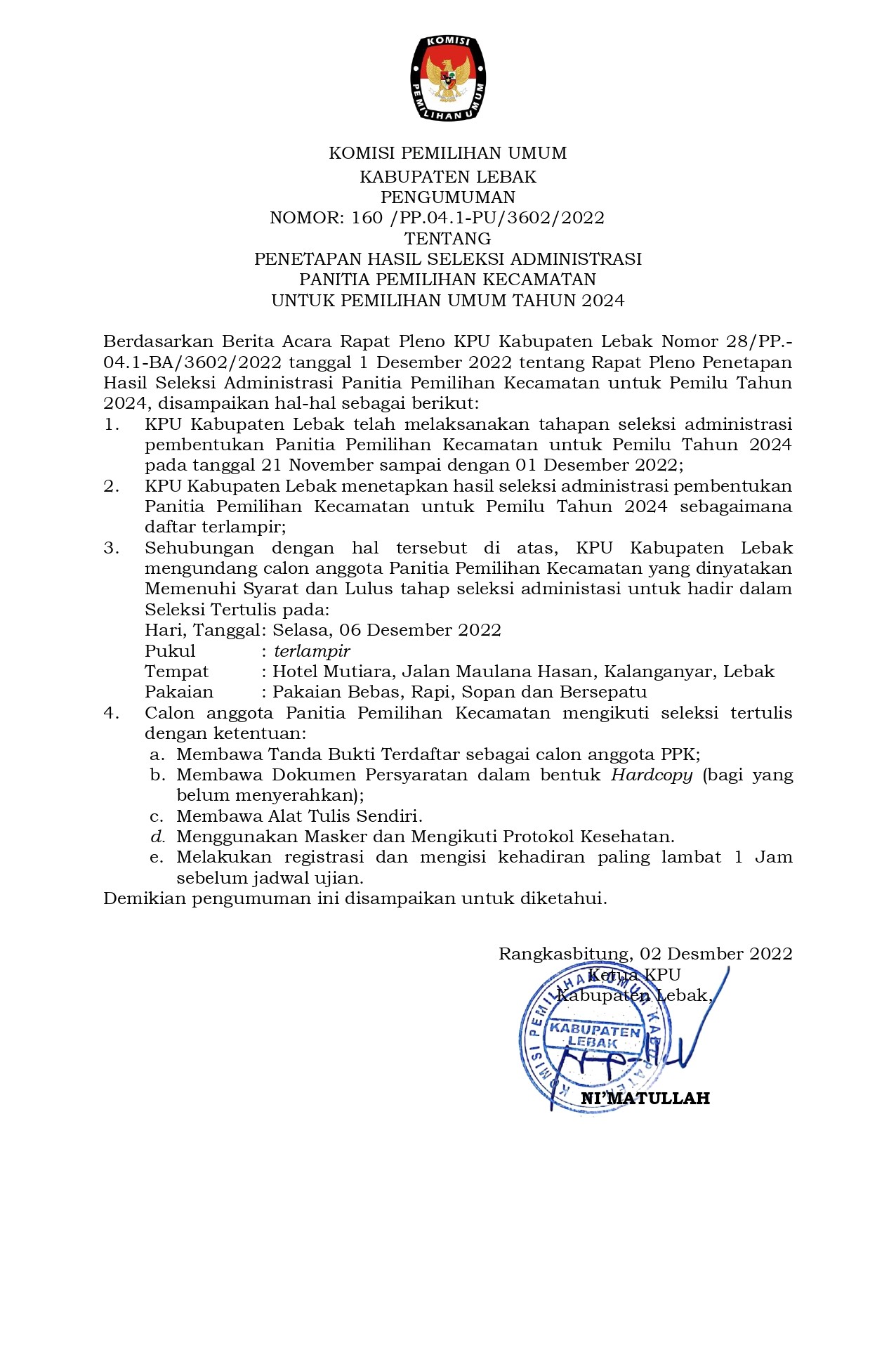 PENGUMUMAN HASIL SELEKSI ADMINISTRASI CALON ANGGOTA PPK PEMILU TAHUN 2024