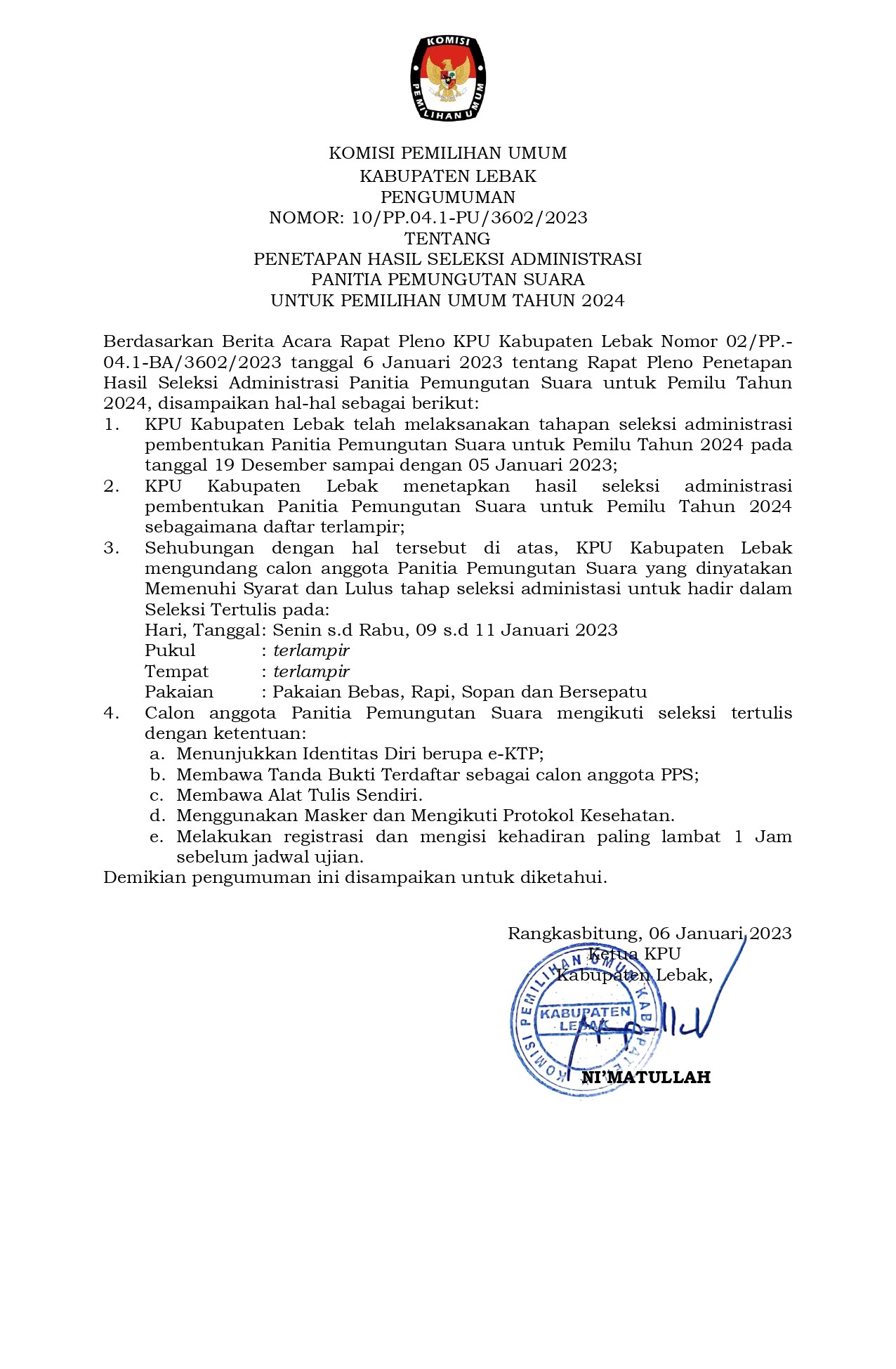 Berdasarkan Berita Acara Rapat Pleno KPU Kabupaten Lebak Nomor 02/PP.-04.1-BA/3602/2023 tanggal 6 Januari 2023 tentang Rapat Pleno Penetapan Hasil Seleksi Administrasi Panitia Pemungutan Suara untuk Pemilu Tahun 2024, disampaikan hal-hal sebagai berikut: