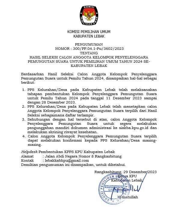 - PPS Kelurahan/Desa pada Kabupaten Lebak telah menetapkan calon Anggota Kelompok Penyelenggara Pemungutan Suara terpilih dari Hasil Seleksi sebagaimana daftar terlampir.