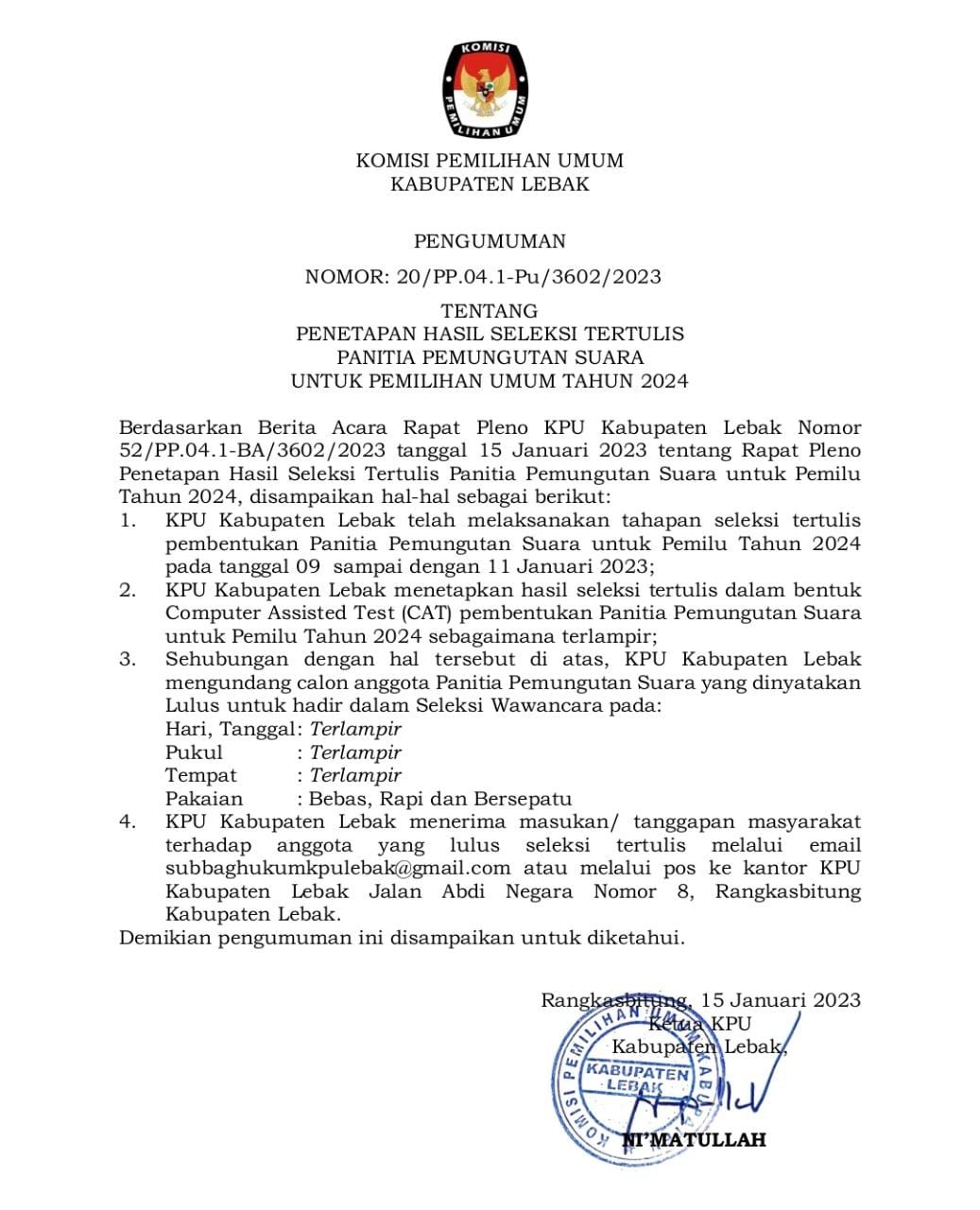 Berdasarkan Berita Acara Rapat Pleno KPU Kabupaten Lebak Nomor 52/PP.04.1-BA/3602/2023 tanggal 15 Januari 2023 tentang Rapat Pleno Penetapan Hasil Seleksi Tertulis Panitia Pemungutan Suara untuk Pemilu Tahun 2024, disampaikan hal-hal sebagai berikut: