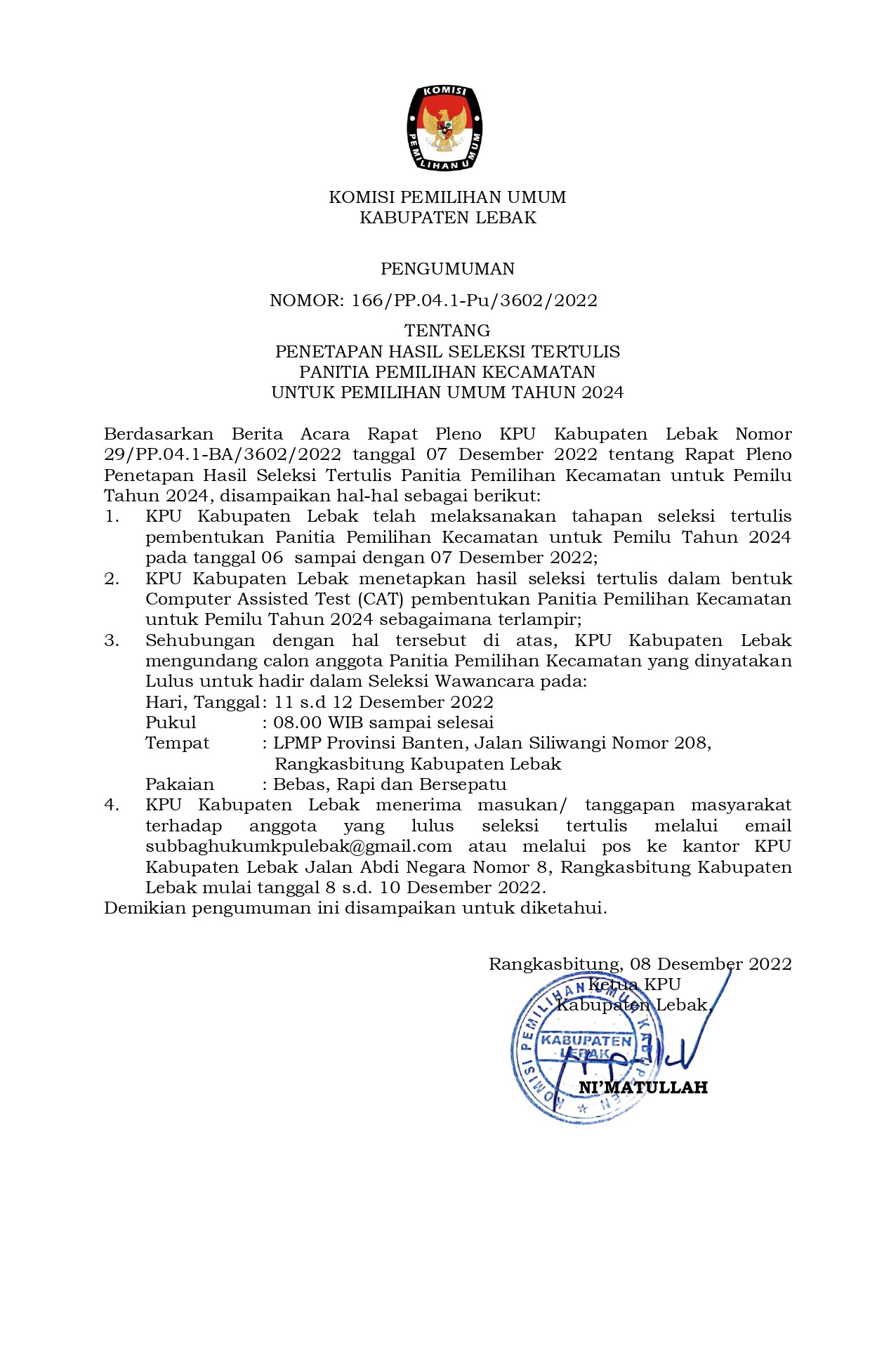 BERIKUT PENGUMUMAN HASIL SELEKSI TERTULIS (CAT) CALON ANGGOTA PPK UNTUK PEMILU TAHUN 2024 DAN JADWAL SELEKSI WAWANCARA
