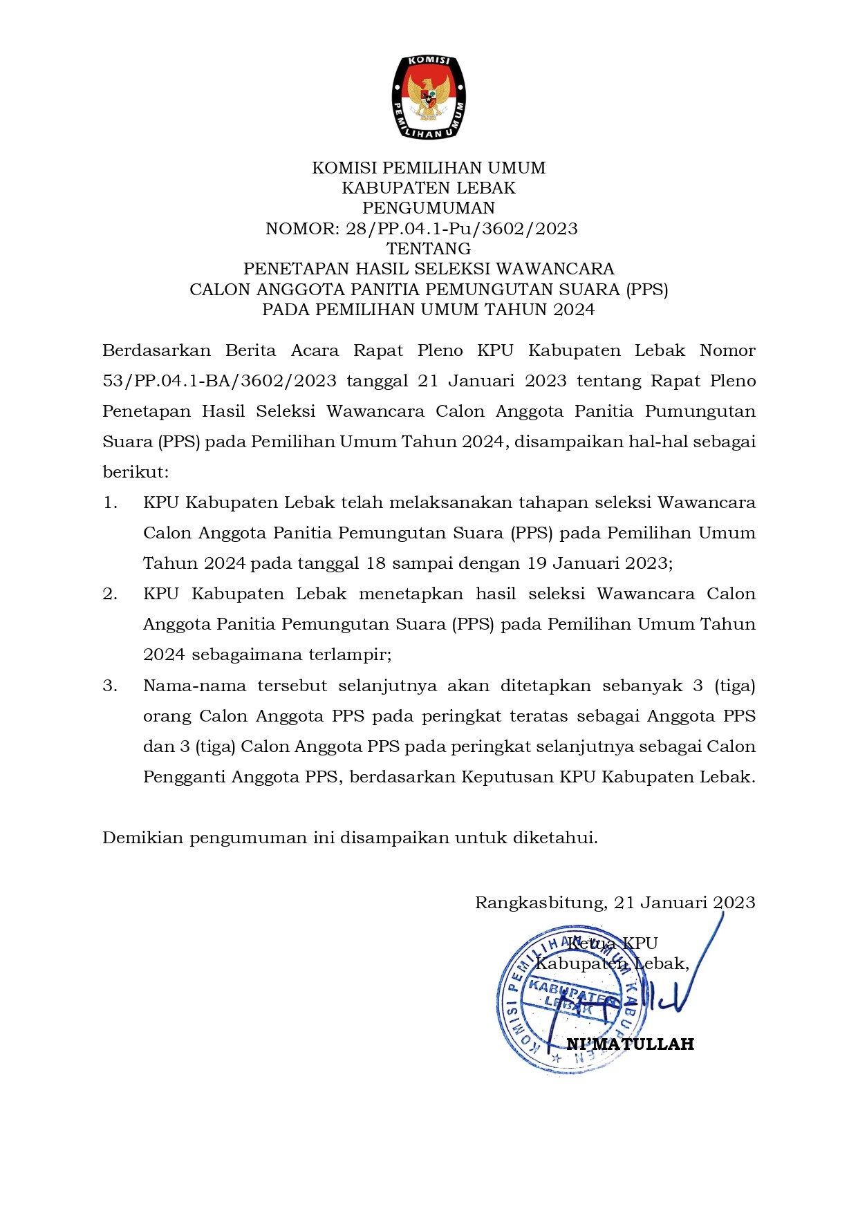 Berdasarkan Berita Acara Rapat Pleno KPU Kabupaten Lebak Nomor 53/PP.04.1-BA/3602/2023 tanggal 21 Januari 2023 tentang Rapat Pleno Penetapan Hasil Seleksi Wawancara Calon Anggota Panitia Pumungutan Suara (PPS) pada Pemilihan Umum Tahun 2024, disampaikan hal-hal sebagai berikut: