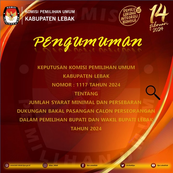 PENGUMUMAN JUMLAH SYARAT MINIMAL DUKUNGAN DAN PERSEBARAN DUKUNGAN BAKAL PASANGAN CALON PERSEORANGAN DALAM PEMILIHAN BUPATI DAN WAKIL BUPATI LEBAK TAHUN 2024