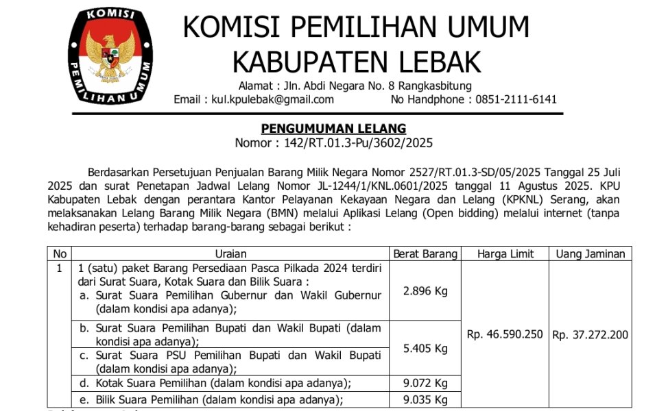 #TemanPemilih, KPU Kabupaten Lebak melelang Barang Milik Negara (BMN) melalui Aplikasi Lelang (Open Bidding) berupa 1 (satu) paket Barang Persediaan Pasca Pilkada 2024 terdiri dari Surat Suara, Kotak Suara dan Bilik Suara :