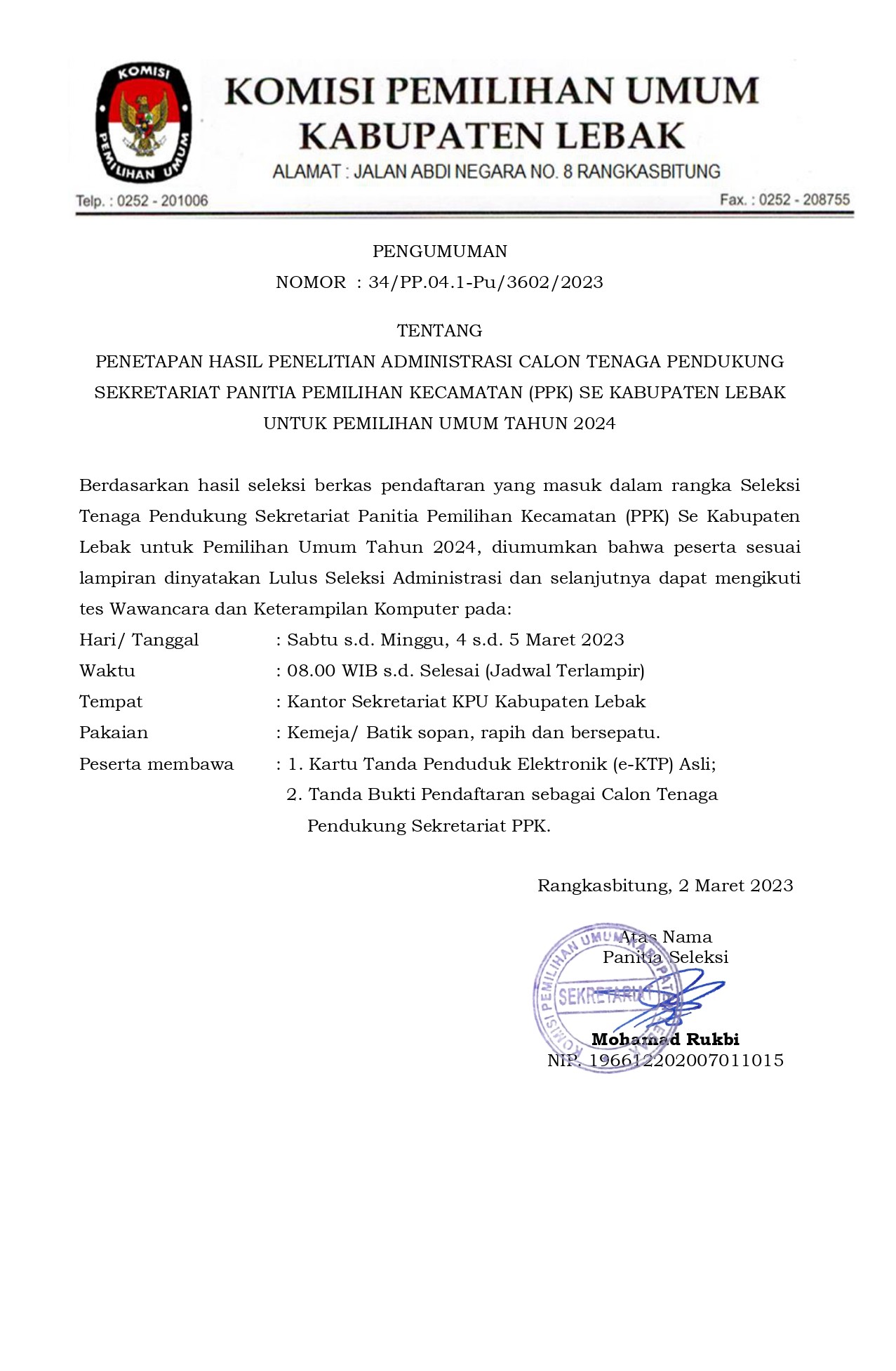 Berdasarkan hasil seleksi berkas pendaftaran yang masuk dalam rangka Seleksi Tenaga Pendukung Sekretariat Panitia Pemilihan Kecamatan (PPK) Se Kabupaten Lebak untuk Pemilihan Umum Tahun 2024, diumumkan bahwa peserta sesuai lampiran dinyatakan Lulus Seleksi Administrasi dan selanjutnya dapat mengikuti tes Wawancara dan Keterampilan Komputer pada:
