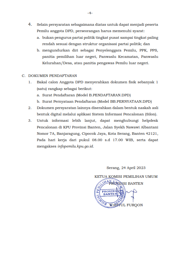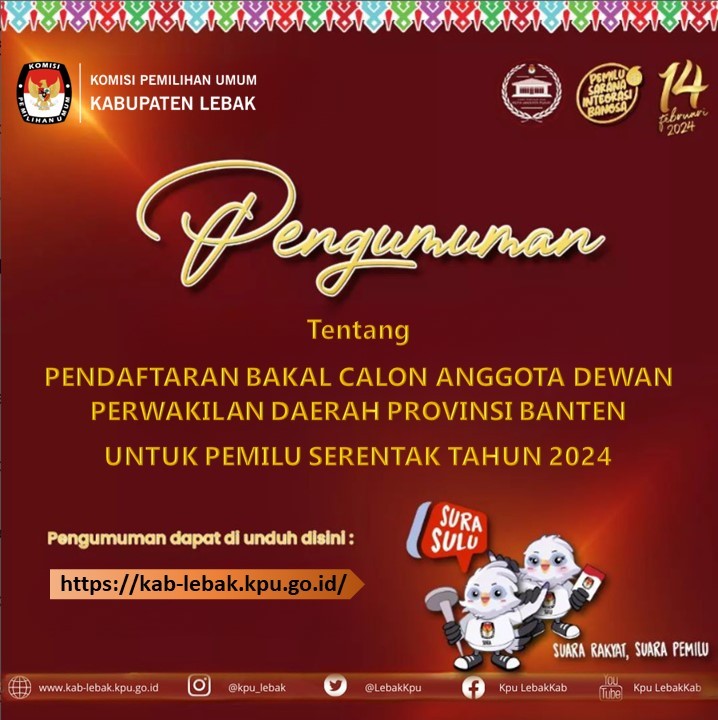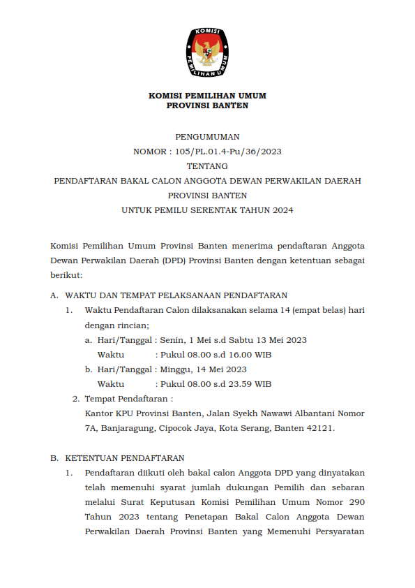 PENGUMUMAN TENTANG PENDAFTARAN BAKAL CALON ANGGOTA DEWAN PERWAKILAN DAERAH PROVINSI BANTEN UNTUK PEMILU SERENTAK TAHUN 2024 Senin, 24 April 2023 00:00 806 Unduh Disini Bagikan: Dilihat 806 Kali.
