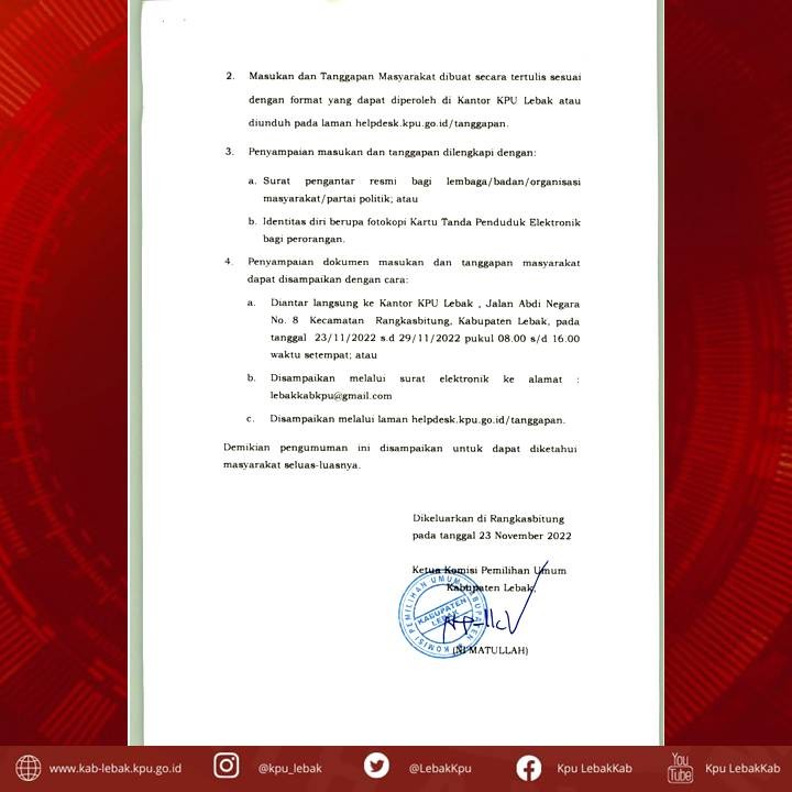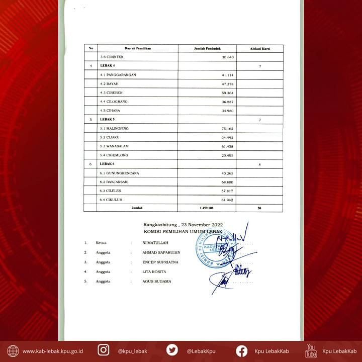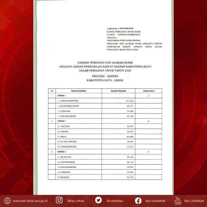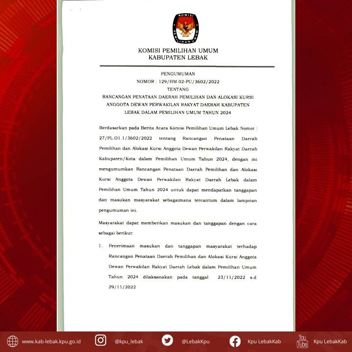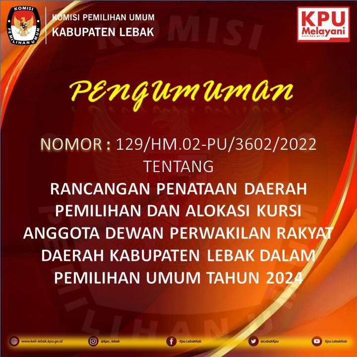 PENGUMUMAN TENTANG RANCANGAN PENATAAN DAERAH PEMILIHAN DAN ALOKASI KURSI ANGGOTA DEWAN PERWAKILAN RAKYAT DAERAH KABUPATEN LEBAK DALAM PEMILIHAN UMUM TAHUN 2024