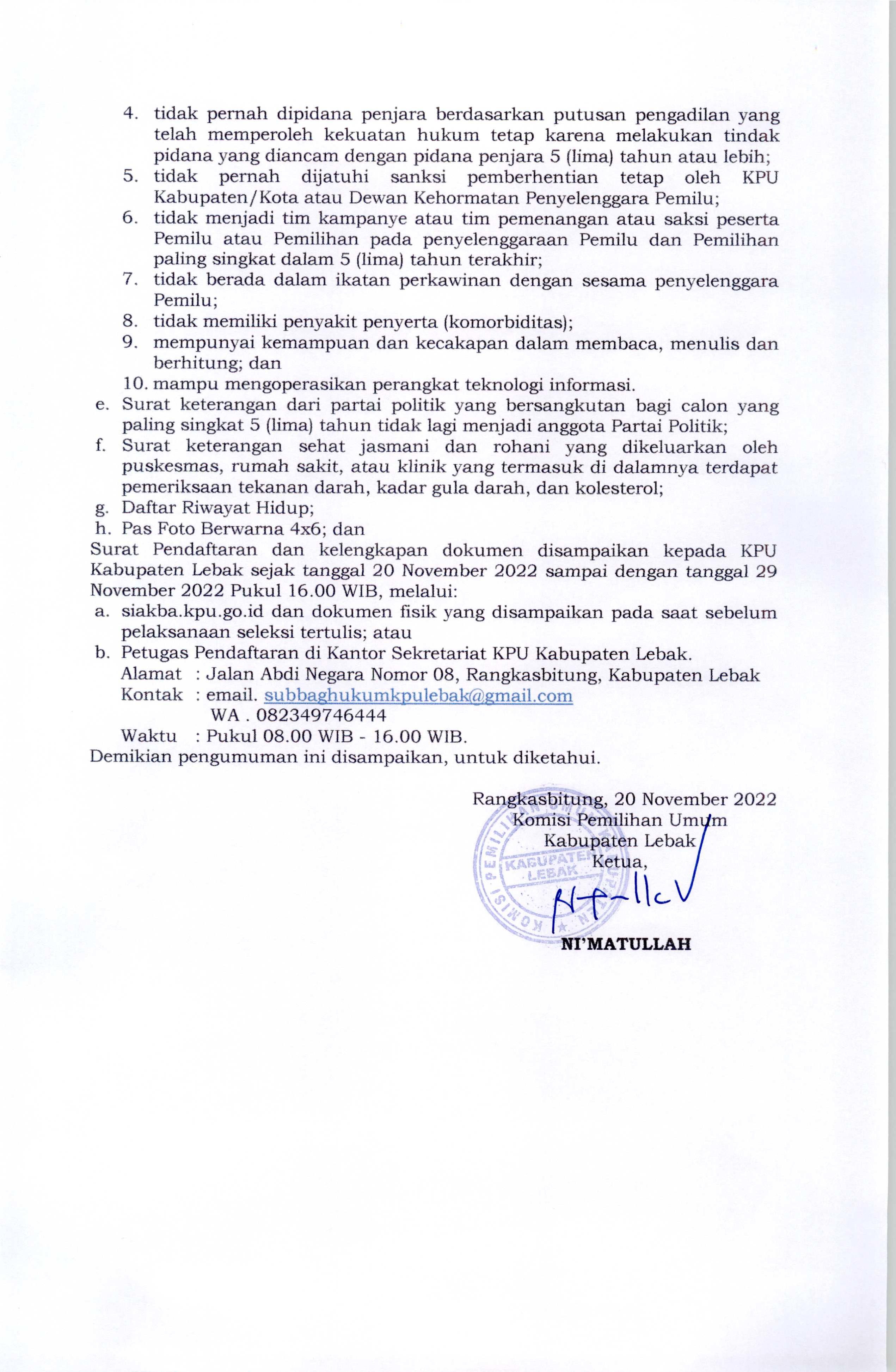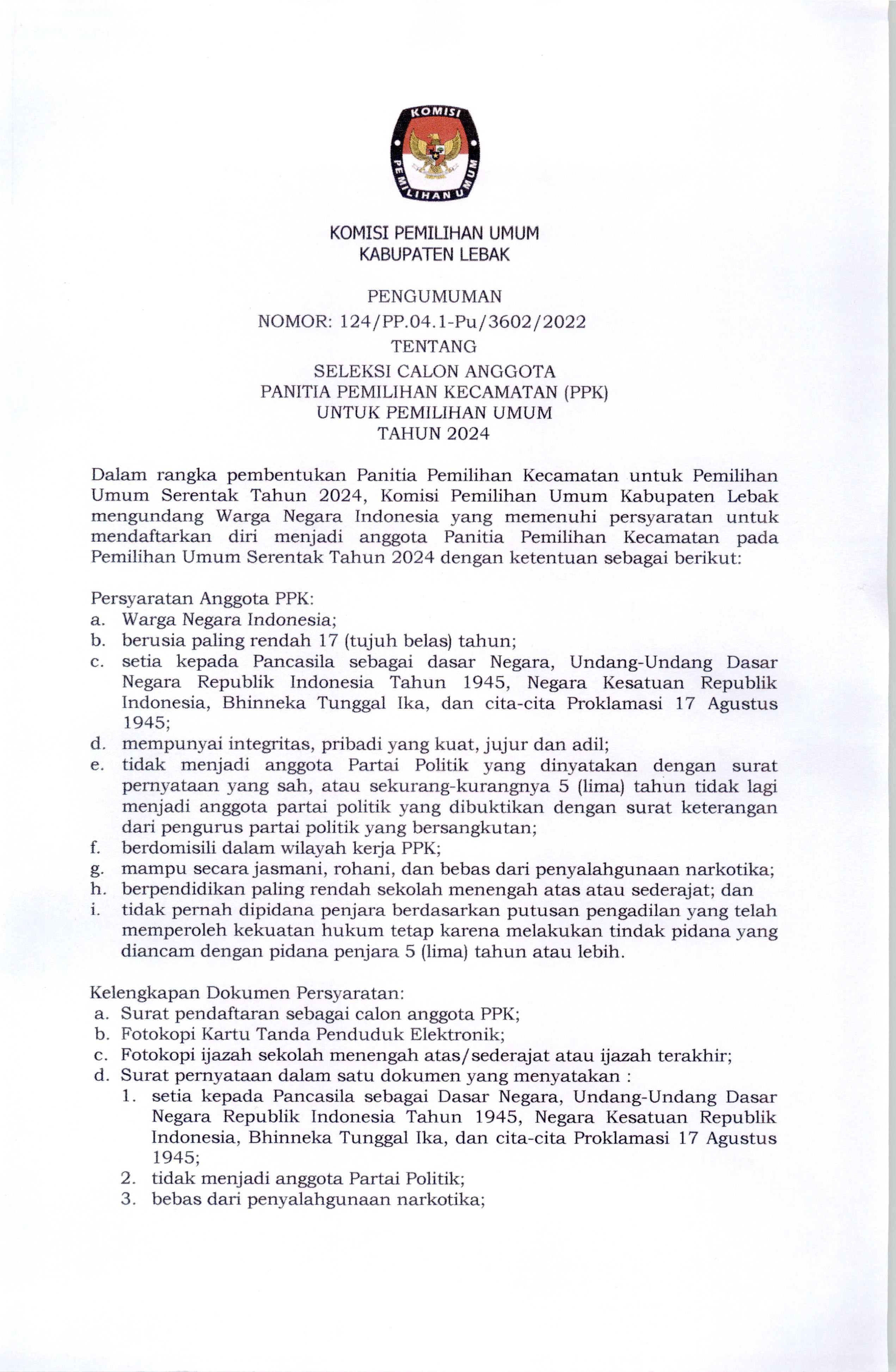 PENGUMUMAN TENTANG SELEKSI CALON ANGGOTA PANITIA PEMILIHAN KECAMATAN (PPK) UNTUK PEMILIHAN UMUM TAHUN 2024