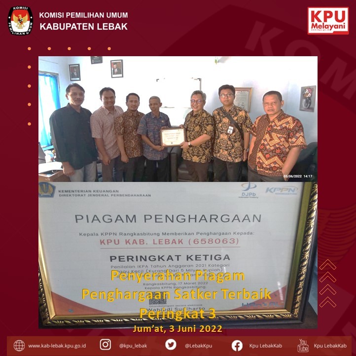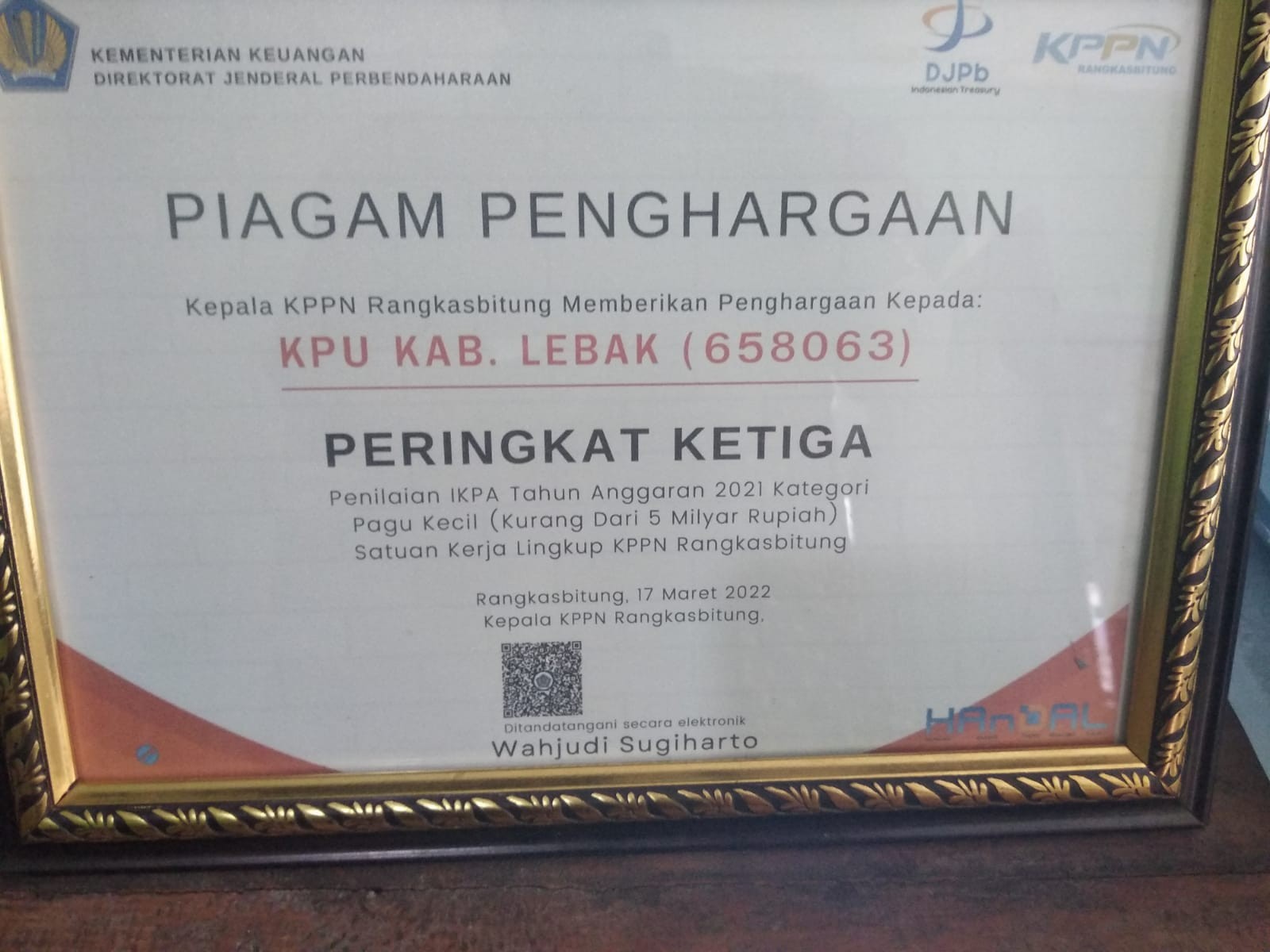 Jum'at 3 Juni 2022 KPU Kabupaten Lebak menerima Penghargaan Satker Terbaik Peringkat Ketiga Penilaian IKPA Tahun Anggaran 2021 Katagori Pagu Kecil yang diserahkan langsung oleh Kepala KPPN Rangkasbitung