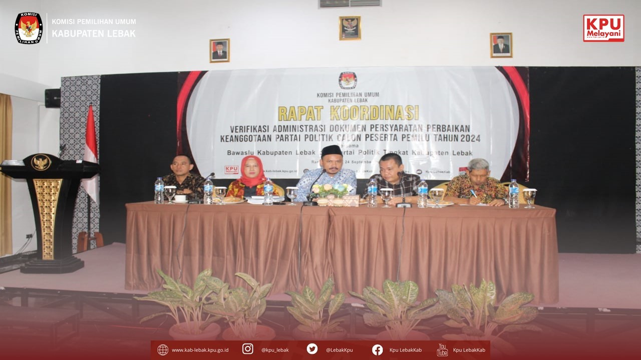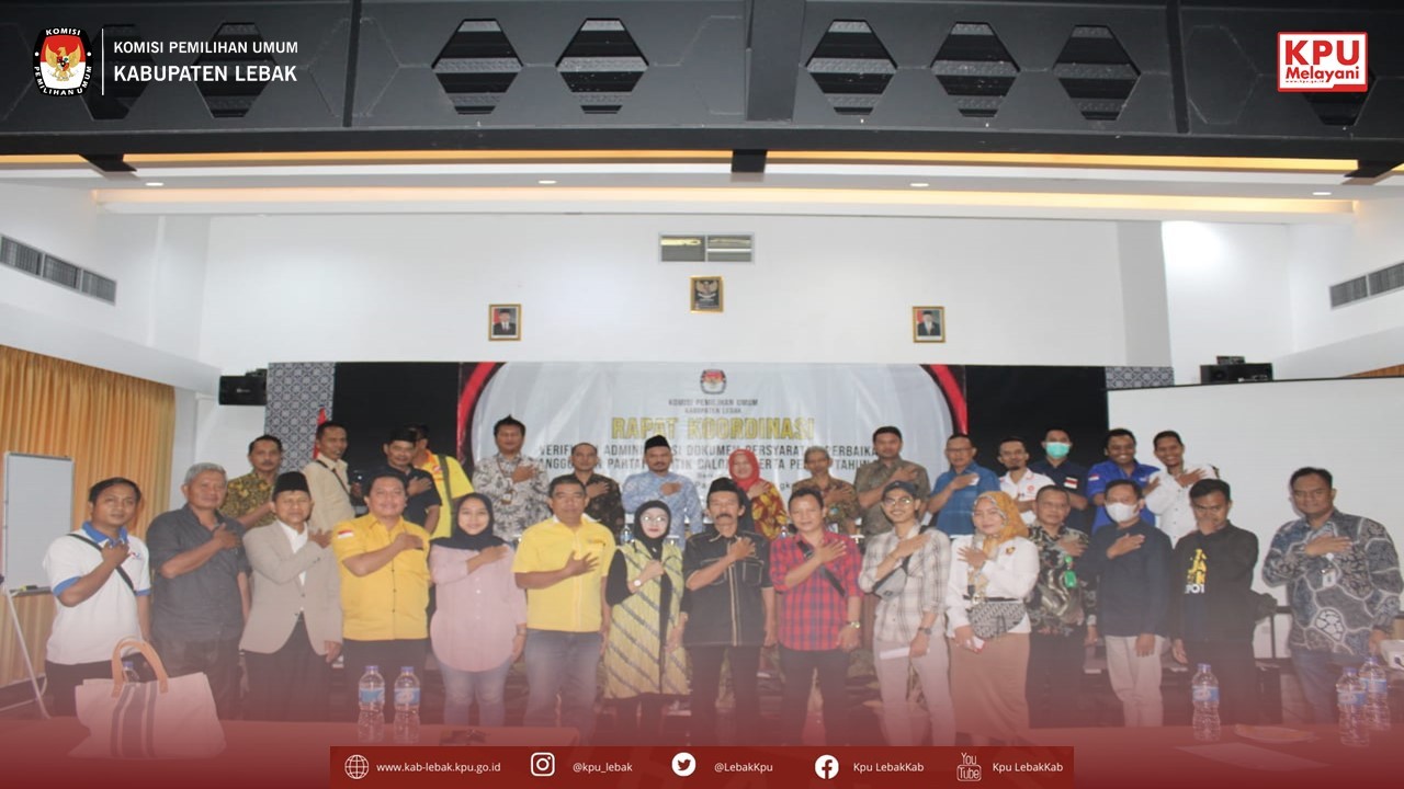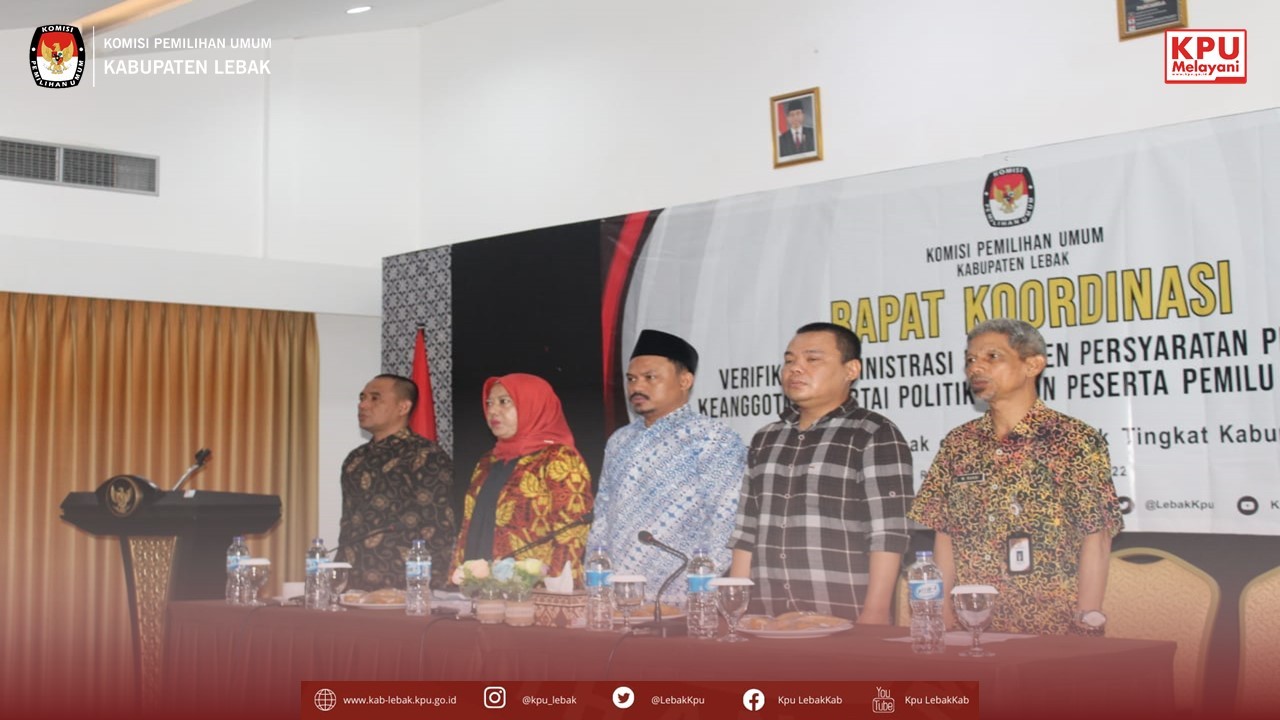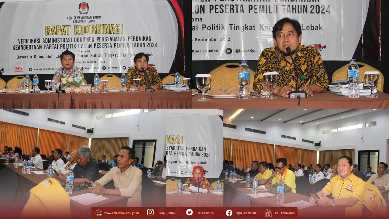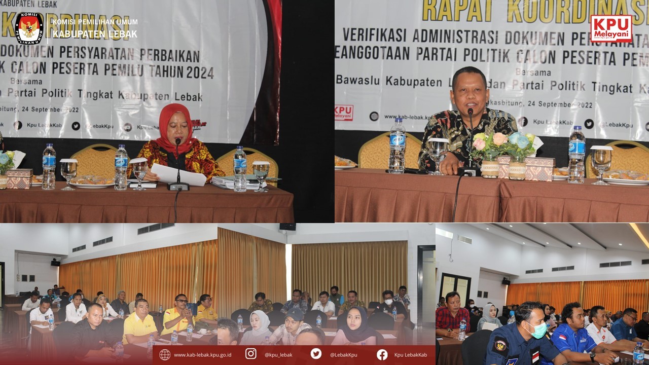 KPU Kabupaten Lebak melaksanakan Kegiatan Rapat Koordinasi Verifikasi Administrasi Dokumen Persyaratan Perbaikan Keanggotaan Partai Politik Calon Peserta Pemilu Tahun 2024 bersama Bawaslu Kabupaten Lebak dan Partai Politik tingkat Kabupaten Lebak bertempat di Hotel Katineung Rangkasbitung, Sabtu 24 Oktober 2022
