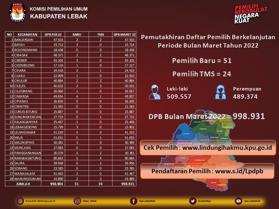 REKAPITULASI DAFTAR PEMILIH BERKELANJUTAN KPU KABUPATEN LEBAK PERIODE BULAN MARET TAHUN 2022 Jumat, 01 April 2022 00:00 379 DPB MARET 2022.jpg BA PDPB MARET 2022 Bagikan: Dilihat 379 Kali.