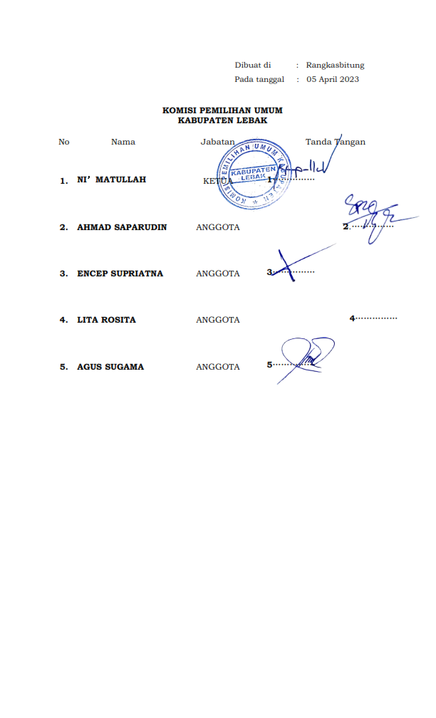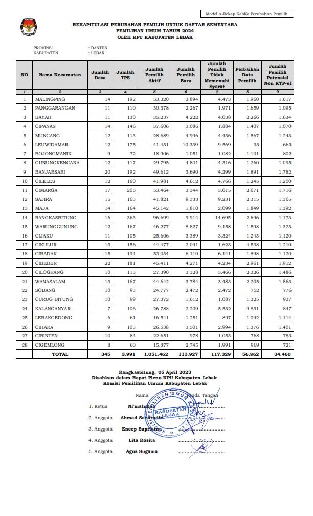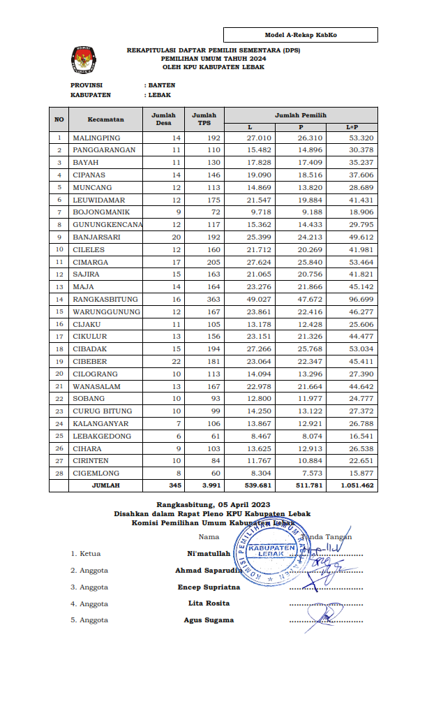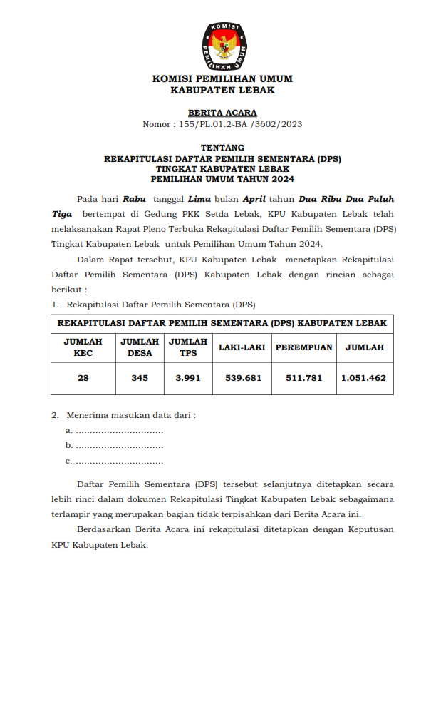 REKAPITULASI DAN PENETAPAN DAFTAR PEMILIH SEMENTARA (DPS) PADA PEMILU TAHUN 2024 KPU KABUPATEN LEBAK Rabu, 05 April 2023 14:00 799 Unduh Disini Bagikan: Dilihat 799 Kali.