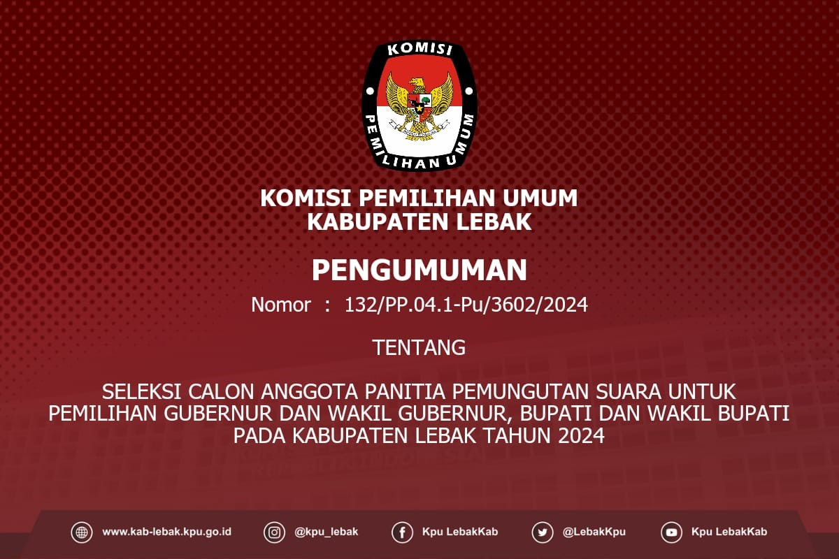 Dalam rangka pembentukan Calon Anggota Panitia Pemungutan Suara pada Kabupaten Lebak untuk Pemilihan Gubernur dan Wakil Gubernur, Bupati dan Wakil Bupati Tahun 2024, Komisi Pemilihan Umum Kabupaten Lebak mengundang Warga Negara Indonesia yang memenuhi kualifikasi untuk mendaftarkan diri menjadi Panitia Pemungutan Suara untuk Pemilihan Gubernur dan Wakil Gubernur, Bupati dan Wakil Bupati.