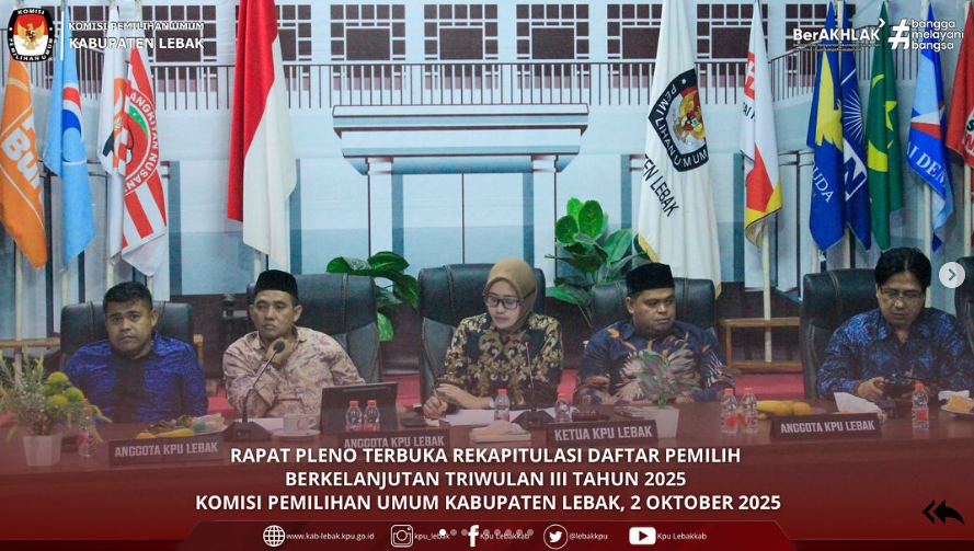 #TemanPemilih, Hari ini (Kamis, 2 Oktober 2025) KPU Kabupaten Lebak melaksanakan Rapat Pleno Terbuka Rekapitulasi Daftar Pemilih Berkelanjutan Triwulan III Tahun 2025 di Aula Nusantara KPU Kabupaten Lebak.